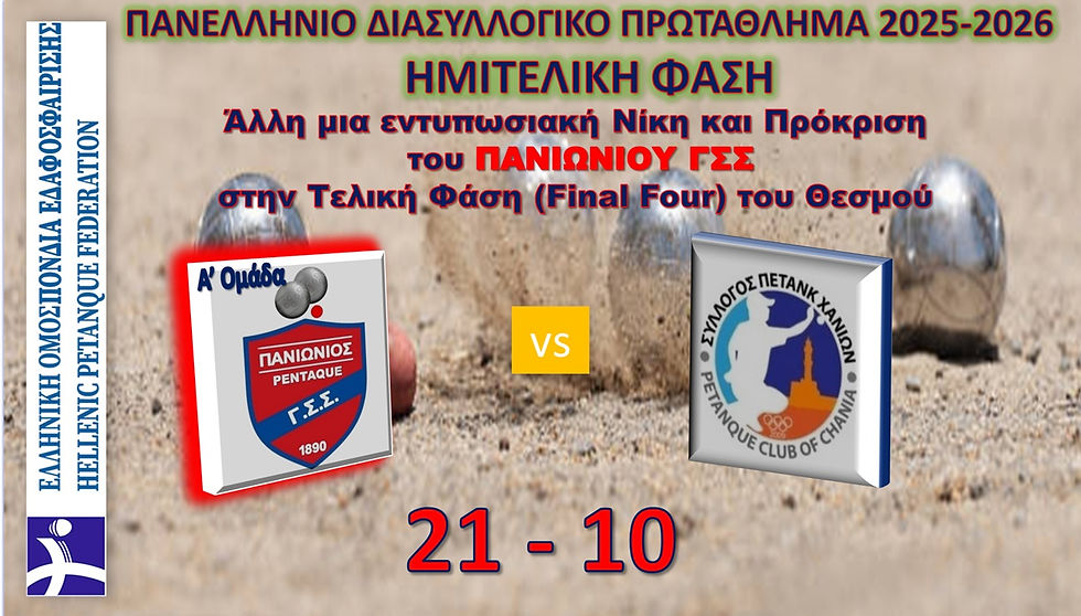 Με εντυπωσιακή εμφάνιση και υψηλό αγωνιστικό επίπεδο, η Α’ Ομάδα Petanque του ΠΑΝΙΩΝΙΟΥ ΓΣΣ (Panionios Petanque) εξασφάλισε την πρόκρισή της στην Τελική Φάση του Πανελληνίου Διασυλλογικού Πρωταθλήματος 2025-2026, επικρατώντας στον ημιτελικό με σκορ 21-10 απέναντι στον Αθλητικό Σύλλογο Πετάνκ Χανίων.